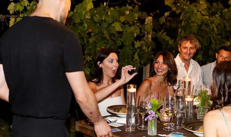 Un momento coinvolgente di pura Magia ed Eleganza. Sotto i vostri occhi accadranno illusioni uniche a distanza ravvicinata. Con l'utilizzo di carte, monete e soprattutto oggetti presi in prestito, così che ogni spettatore avrà un proprio ruolo e coinvolgimento personale durante lo show.